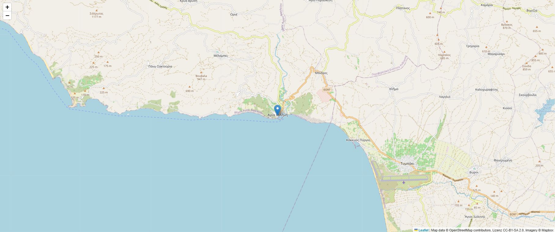 Agia Galini liegt am Golf von Messara, etwa 24 Kilometer südöstlich von Spili. Die kompakte Ortsstruktur umfasst enge, gepflasterte Gassen, die sich vom Hafen hinaufziehen und von weißen Häusern gesäumt sind. Der Hafen selbst ist ein zentraler Punkt, wo kleine Ausflugsboote anlegen, die zu den umliegenden Stränden und Buchten fahren246. Eine markante Fußgängerbrücke über den Fluss Platis verbindet die beiden Teile des Strandes, der grobkiesig ist und sich ideal zum Entspannen eignet6.