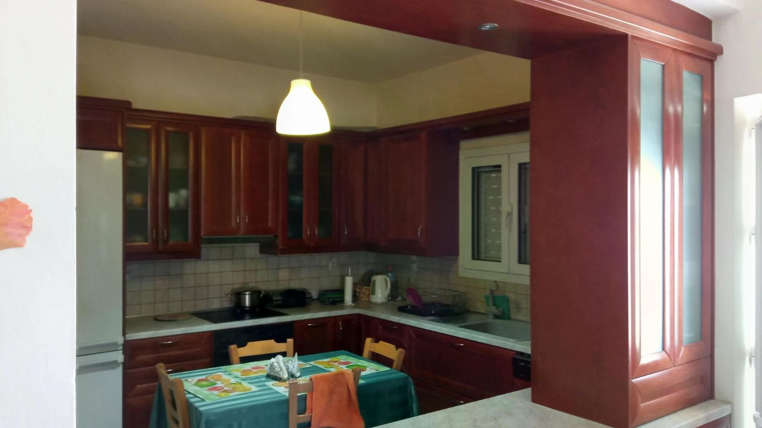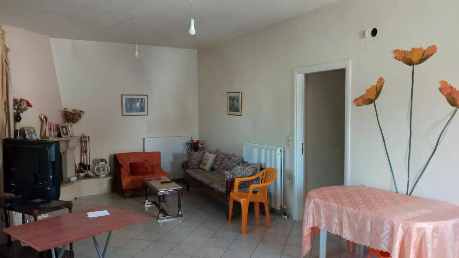 Die Küche ist das Herzstück – voll eingerichtet mit Elektrogeräten (Backofen, Herd, Kühlschrank), einer geräumigen Arbeitsplatte aus Fliesen und einem kleinen Abstellraum für Vorräte. Stellen Sie sich vor, wie Sie frische Tomaten aus dem eigenen Garten (den Sie mühelos anlegen können) zu einer griechischen Meze verarbeiten, während der Duft durch den großen, offenen Wohn-Essbereich zieht. Dieser Raum mit seinen bodentiefen Aluminiumfenstern lädt zum Zusammensein ein: Ein gemütliches Sofa für Netflix-Abende, ein Esstisch für 8 Personen und genug Platz für Weihnachtsfeiern oder Geburtstags-partys. Die Fliesenböden sind kühl im Sommer und leicht zu pflegen – typisch kretisch-praktisch.