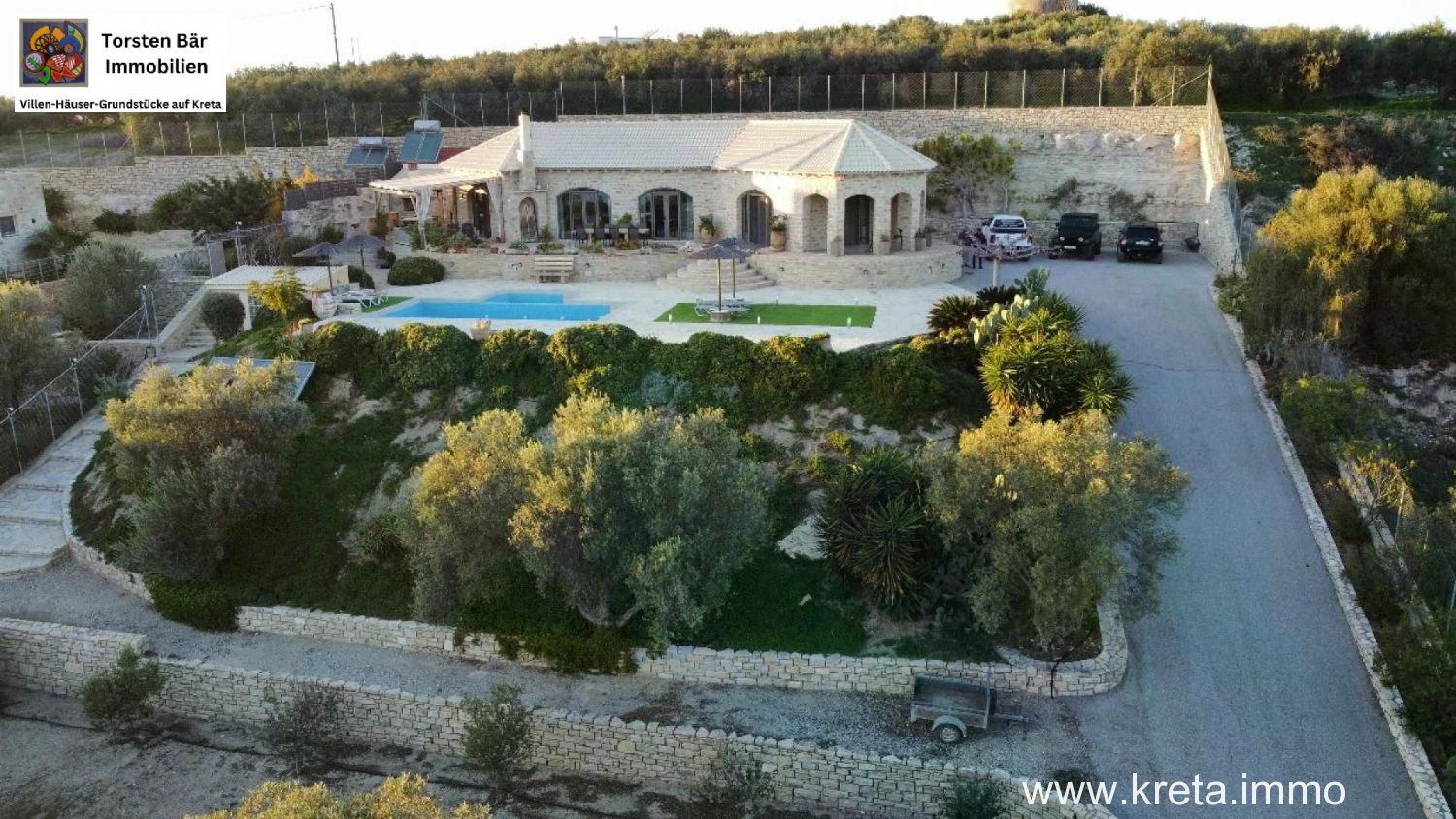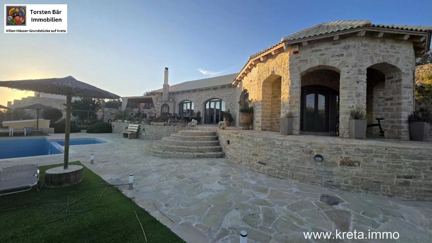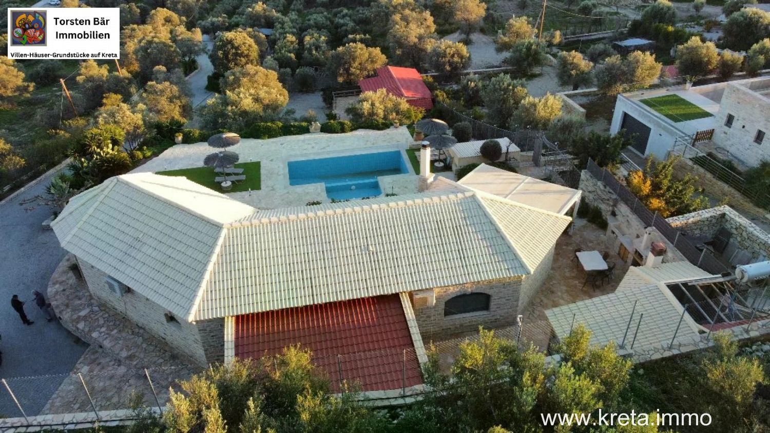 als Torsten Bär, Ihr Real-Estate-Experte mit Sitz in Heiligenhaus und Herz auf Kreta, habe ich schon unzählige Perlen der Insel gesehen – aber diese 119 m² moderne Naturstein-Designvilla auf 3.277 m² Grund in Pitsidia? Die hat mich sofort umgehauen. Stellen Sie sich vor: Sie sitzen auf der großen Veranda, ein kühler Raki in der Hand, blicken über üppige Olivenhaine und majestätische Berge, während der Pool im Hintergrund glitzert. Das ist nicht nur eine Immobilie – das ist Ihr Stück Südkreta, wo Zeit stillsteht und das Leben pulsiert. Ich kenne Pitsidia wie meine Westentasche: Dieses ruhige Dorf, nur 4 km von Matala und 1 km vom traumhaften Kommos-Strand, ist der Sweet Spot für alle, die Authentizität suchen, ohne auf Komfort zu verzichten. Lassen Sie mich Ihnen diese Villa zeigen, als wären wir zusammen vor Ort.