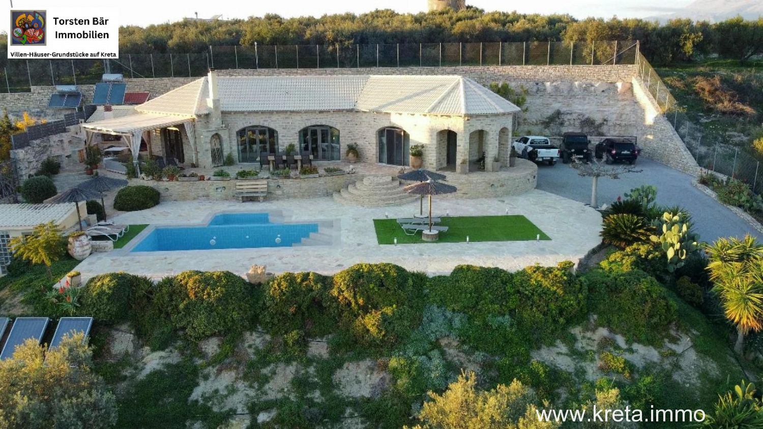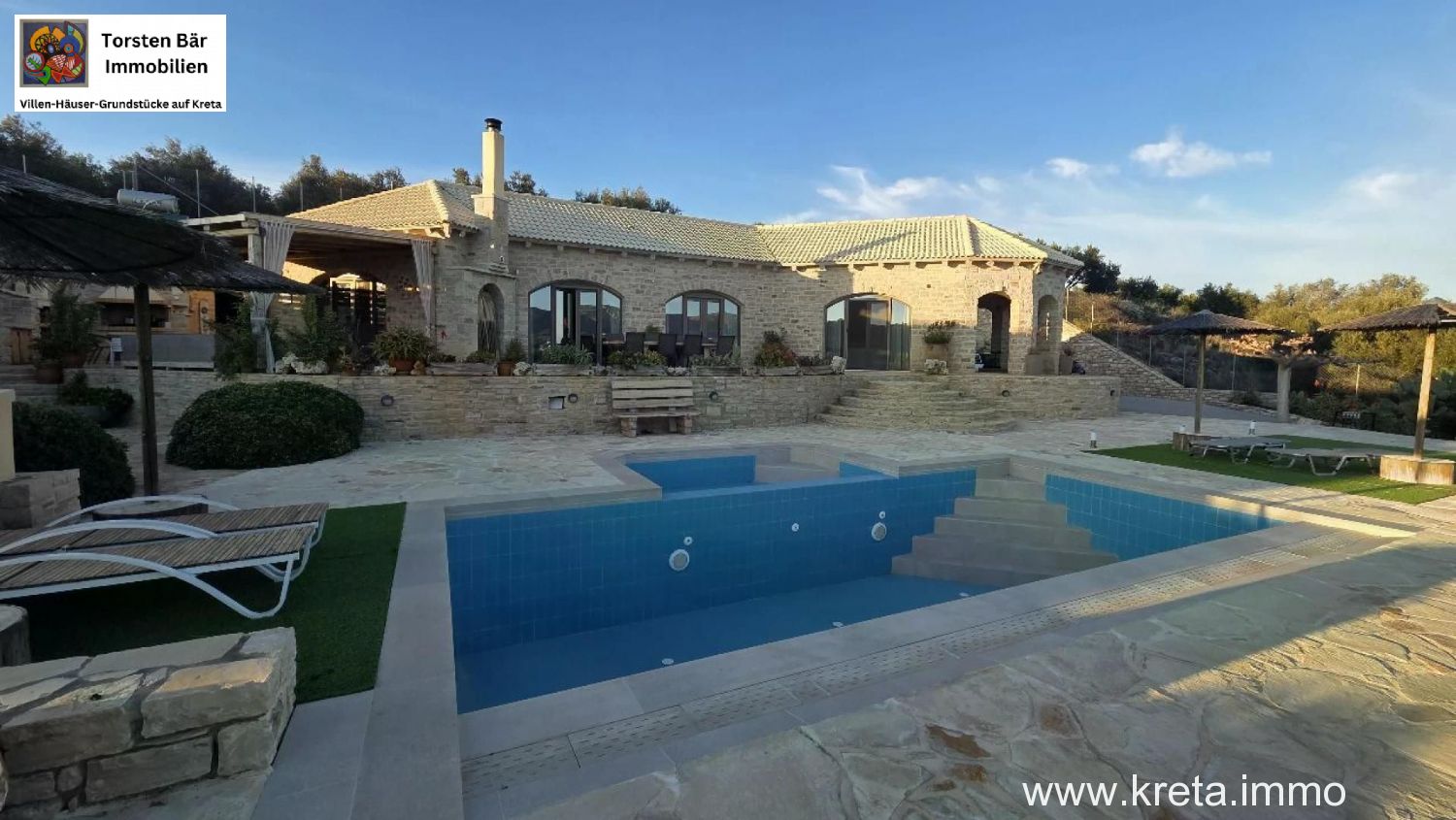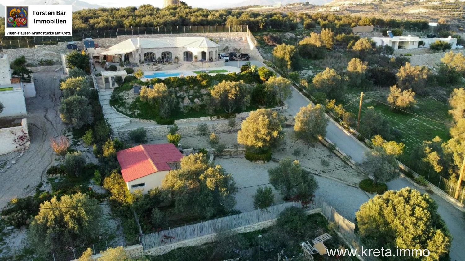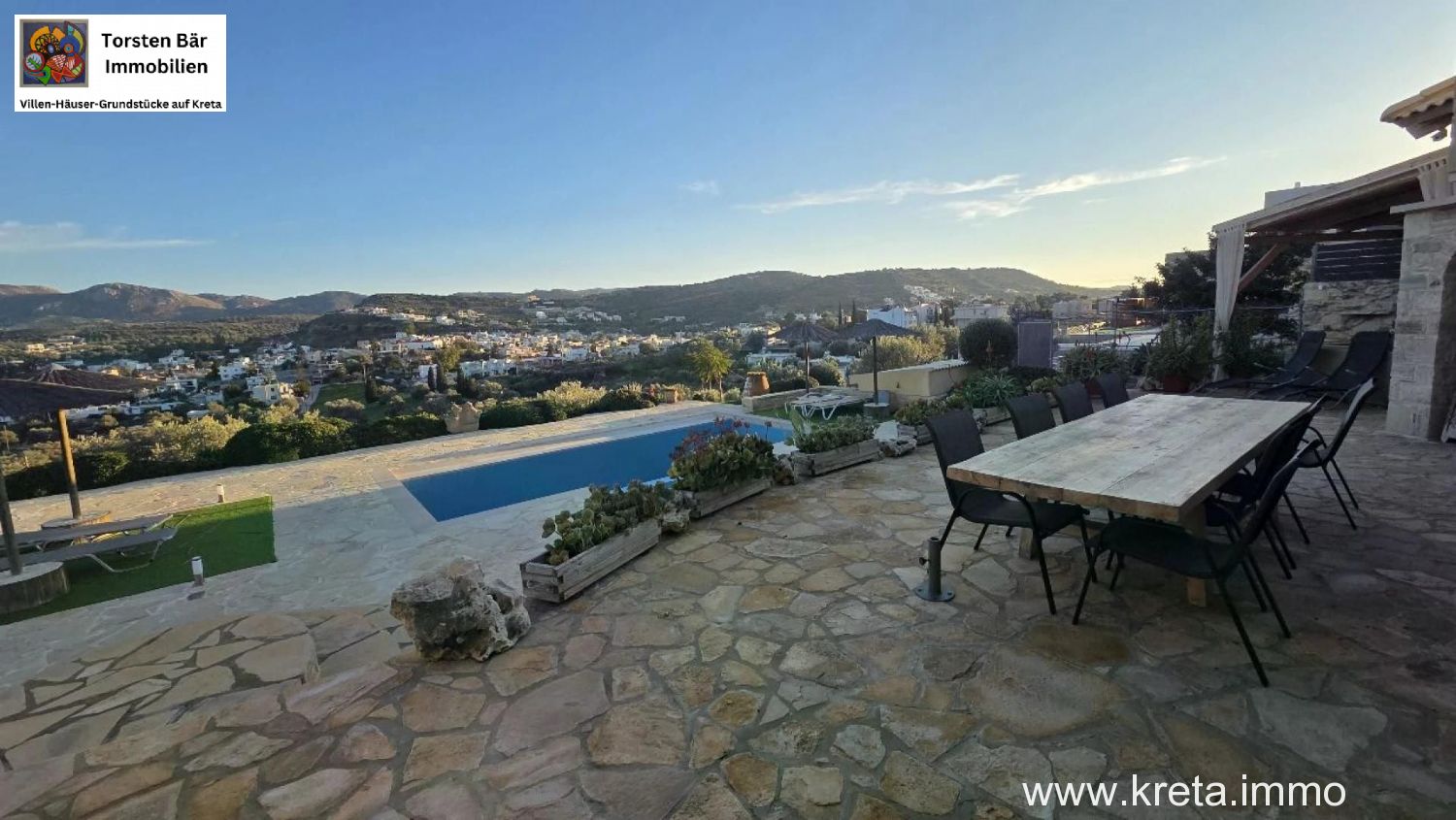 als Torsten Bär, Ihr Real-Estate-Experte mit Sitz in Heiligenhaus und Herz auf Kreta, habe ich schon unzählige Perlen der Insel gesehen – aber diese 119 m² moderne Naturstein-Designvilla auf 3.277 m² Grund in Pitsidia? Die hat mich sofort umgehauen. Stellen Sie sich vor: Sie sitzen auf der großen Veranda, ein kühler Raki in der Hand, blicken über üppige Olivenhaine und majestätische Berge, während der Pool im Hintergrund glitzert. Das ist nicht nur eine Immobilie – das ist Ihr Stück Südkreta, wo Zeit stillsteht und das Leben pulsiert. Ich kenne Pitsidia wie meine Westentasche: Dieses ruhige Dorf, nur 4 km von Matala und 1 km vom traumhaften Kommos-Strand, ist der Sweet Spot für alle, die Authentizität suchen, ohne auf Komfort zu verzichten. Lassen Sie mich Ihnen diese Villa zeigen, als wären wir zusammen vor Ort.