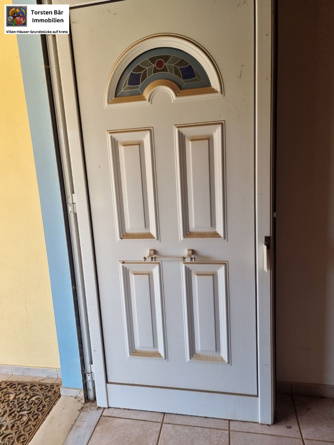 Über eine kurze Treppe gelangt man auf die vordere Veranda und den Eingang. Die Doppelglasfenster sind alle mit Rolläden versehen. Die Fußböden sind hell gefließt.